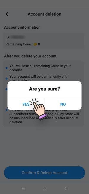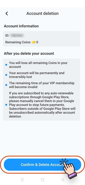 • For Google Play subscriptions, manually cancel them in your Google Play account to stop future payments. Subscriptions outside Google Play will be unsubscribed automatically after account deletion.